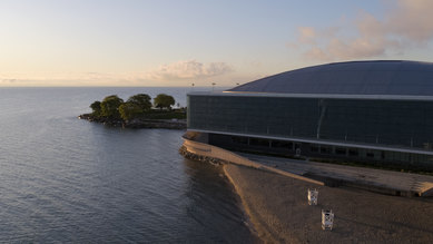To complement the aesthetics of the building, the engineers designed a curvilinear wall that blends into its surroundings while also expressing itself as an architectural feature. Each wall section was individually precast to create a smooth, curving design that mimics the shape of a crashing wave. The precast approach also facilitated a more efficient and cost-effective construction process along the beach bordering the building.