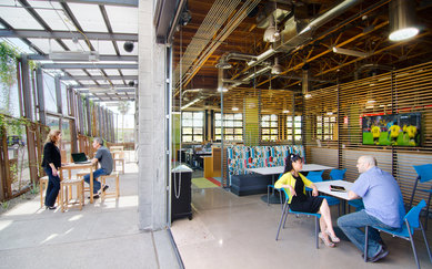 DPR selected a non-descript building centrally located in a re-emerging district, notable only for having once been an adult-themed boutique. SmithGroup and DPR incorporated a wide range of green building solutions, including a passive cooling system—comprised of a solar chimney, four evaporative-cooling shower towers, eight Big Ass Fans® and 87 operable windows—reducing AC requirements. Solatubes® infuse the workspace with daylight and reduce lighting loads by 70%, while a "Vampire” shut-off switch cuts off 90% of plug loads at night. Online monitoring systems allow staff to track and view energy and water use in real-time.