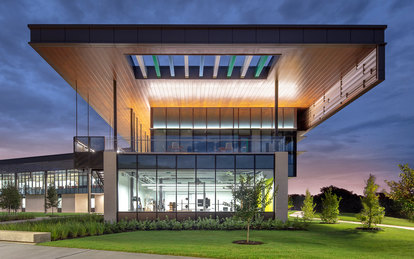 The building’s orientation and inviting facade creates a natural transition to the campus green (a key pedestrian route through campus) and future growth area to the north.