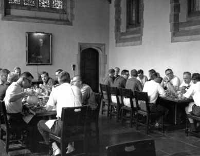 A specifically designed elevator with three stops and entrance from three sides provides barrier-free access from the historic main lobby to the dining hall and library.