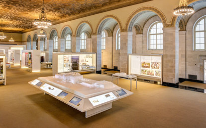 Frosted white translucent plastic is used to clad the central elements for seamless integration of architecture and exhibit spaces. This maintains the distinct character of the room and brings a dialog between old and new.