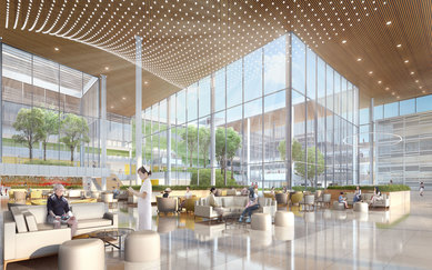 医院的主入口位于医院正中央的中庭,它借喻汉中的肥沃土地,设计了多个庭院,以各式不同的景观给使用者提供放松的机会。